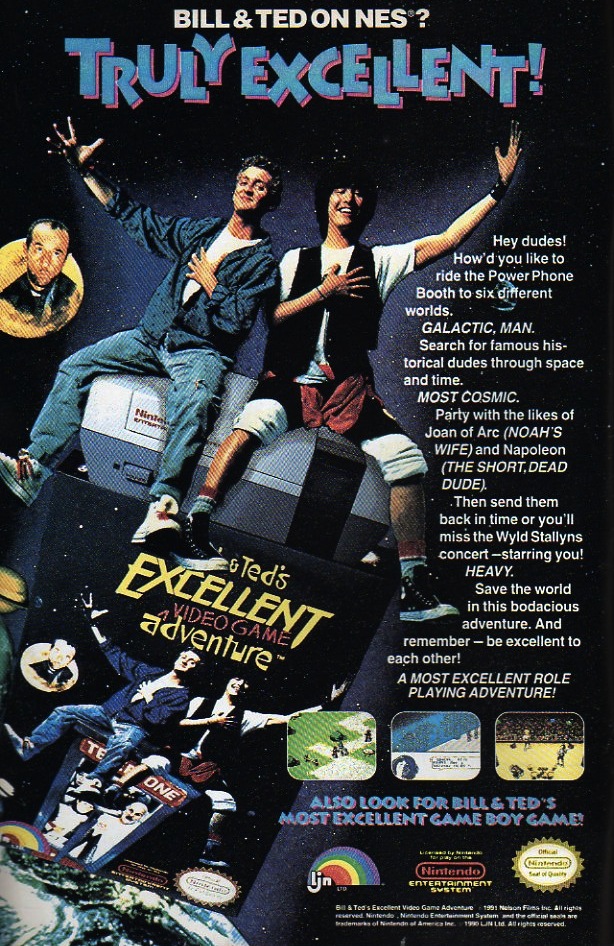 I haven’t actually blogged about Bill & Ted’s Excellent Adventure because I haven’t seen it in quite a few years, but it was a definite cable staple of my childhood and a movie I really loved. This ad of the NES video game based partially on the movie comes from 1991’s Silver Surfer #54. I don’t believe I ever played the game which is probably for the best because these kinds of things tended to overwhelm and sometimes still do. I like how these ads show big pieces of art work or photos and then very tiny in-game footage, but what else are you gonna do, show full page 8-bit versions of Rufus? I’m probably good on catching this game on the flipside, but I do want to find some of the action figures that play guitars.