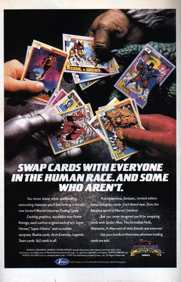 I love this ad, but at the same time it’s kinda weird, right? Why would they have their trading cards fanned out light playing cards? Any time I traded cards with my friends, we just grabbed the other persons extra/doubles pile and just flipped through. Better yet, why are some of the cards flipped over? Maybe to show off the card backs, but they’re not very well showcased. Finally, who does the hairy ape-like hand at the top belong to? I’m guessing the human hand is supposed to be “You, the consumer!” and the others are Spidey, Doctor Doom and the Lizard (what are they doing hanging out?!) but that top one is either super obscure or an extra fake arm the prop company had lying around for the photo shoot. Man, I’ve thought about this WAY too much. Back to work!