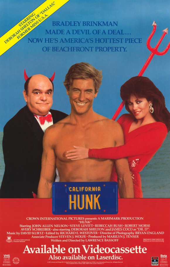 Let it never be said that I don’t watch the occasional movie for the ladies. What would you call T&A when it comes to dudes? Well, whatever the case, Hunk, has it in spades as geeky Bradley Brinkman makes a deal with a devil played by Deborah Shelton to become Hunk Golden, beach superstar. See, Bradley develops a program called something like “The Yuppie Program.” The interesting thing about this is that, as far as I can remember, it’s never really explained what this program is or does, but it becomes very popular. I’m wondering if the writers thought it might take too much time to actually explain the program to a largely computer ignorant viewership. Anyway, the program’s a hit and the company Bradley works for thinks he’s an actual yuppie so he gets sent to the beach (the Hamptons, maybe?) to work on another one. The problem is that he’s a huge geek, so he has trouble fitting in, even with the help of his loudmouthed landlord.