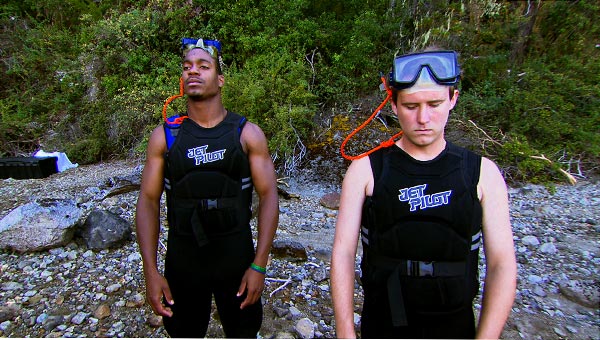 Before things kick off (I actually thought all of the finale would be pushed to the next ep, but that’s not the case) TJ reminds everyone that the first team to finish for each sex wins $100,000, second place gets $50,000 and the third gets zip. He then explains the first leg of the race which is all water. 200 yards away from them on the beach each team has a kayak waiting for them. But they’re not just swimming to get there, they’re being pulled underwater on a ski line by a boat. The longer they can hold on the less they have to swim. Once they’re in the kayak, they have to paddle for three miles to another beach where they change into running clothes and are on to a foot race with checkpoints and puzzles.