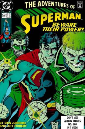 I grabbed this issue of Adventures Of Superman #473 from 1990) because it’s not part of the wonderful Man Of Steel trade series, it has Green Lanterns in it and that Dan Jurgens cover sure looked neat! Written and drawn by Jurgens, the issue was great looking, but it was the kind of story I’ve read before. Basically Hal Jordan’s being held captive by a giant alien who crashed and remained underground for many years. He sens out a distress signal for Superman who winds up teaming with Guy Gardner. Unfortunately, this is also the version of Guy that really grates on me: the asshole loudmouth who never shuts up. I’m more a fan of the confident, but layered version Beau Smith wrote in Guy Gardner: Warrior.
