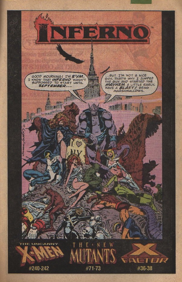 I know zilch about the 1989 X-Men crossover Inferno. I think I might have attempted to read the trade when I was at Wizard, but don’t have any distinct memories of it. Anyway, when I saw this ad in the 1989 issue of Punisher #15 I had two main thoughts. The first is one my pal Sean T. Collins examines over at his Tumblr Superheroes Lose. Sean posts covers of the age old comic book trope of superheroes lying defeated on the cover to show readers just how serious of a threat the bad guys are. This ad made me wonder if that gag actually works. Maybe on inexperienced readers? Who knows.