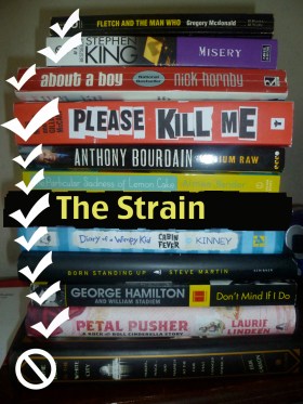And with that, this Ambitious Reading List comes to an end many months after the summer. I really like this format because it takes a very large pile of books I have in my to-read pile (now a purple bin in our storage unit, actually), condences them down to a varied dozen and makes me focus on them. Overall, I’d say this group was greatly eclectic and very interesting. I might have quit on one book and replaced one with The Strain, but overall, I had a great time and have not only arranged my next ARL, but even finished the first book already!
