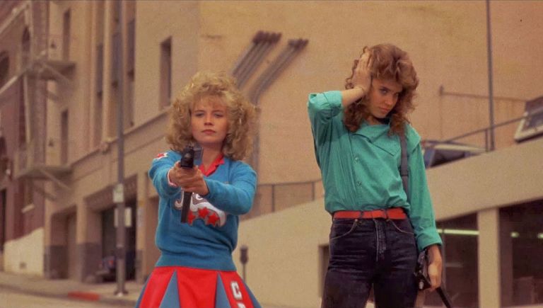 To back up a bit, the film’s about two sisters — Regina (Catherine Mary Stewart) and Sam (Maroney) — who happen to survive the passing of a comet that turns everyone else in the greater LA area into dust or zombies. In their travels to the local radio station (did they ever really look like that?) and the mall, Regina and Sam run into fellow survivor Hector, stock boy punks with uzis and scientists from a think tank played by Mary Woronov (also of Chopping Mall fame) and Geoffrey Lewis who is such a “that guy” actor that I’m sure we’ll see him again.