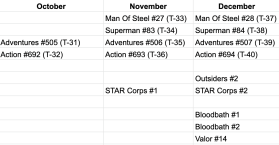 So, there you have it. Superman regained his rightful place in all four of his titles by October, 1994 (going by cover dates, not true on-sales). As I go forward, I’ll be reading them in order of what’s known as the Triangle Number. Given how many Super titles there were at this point, DC labeled them with these numerals so readers knew the correct reading order. While they’re mostly on the main four books, they also appear on important one-shots and the eventual fifth Superman title as we continue. When it comes to the spinoff titles and other appearances, I’m keeping things organized by cover date as you can see in the above image. It’s wild that there are only 16 Superman related appearances in the last few months of 1993 because there will be WAY more moving forward.