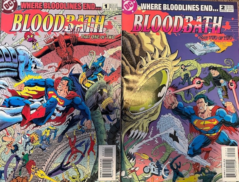 In the meantime, before moving on to 1994, we have a few more appearances to talk about, some of which are not on DCUI so I had to grab them myself, but I’ll note those when they come around. First up, let’s talk about the grossly titled Bloodbath, which is not on DCUI. This two-issue mini from writer Dan Raspler and artists Chuck Wojtkiewicz, Bill Willingham, Sal Velluto and Val Semeiks closes the book on the Bloodlines annuals that came out all through ’93. Clearly an attempt to bring in some of that edgy Image energy, the event revolved around a group of alien Parasites who land on Earth and start feeding on human spinal fluid. Most of the victims die, but a few dozen survive and get crazy super powers.