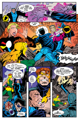 Alright, Superman’s gotten enough of the spotlight, I know what you’re all thinking, “What about Eradicator?” Well, you’re in luck because he had TWO appearances this month! Technically, he shows up as a shadowy silhouette in the very last panel of Hawkman #5 by John Ostrander and Steve Lieber, I’ll explain what’s going on next time, though I did chuckle because, even though this issue is on the DC app, I have it in my collection because Lieber came to sign at my beloved JC’s Comic Shop around that time. Erad had a more substantial showing in Outsiders #3 by James W. Barr and Paul Pelletier. In this one, he appears about halfway through and starts fighting the team he will eventually join. Along the way, he rips Faust’s arm off, but then decides that they are innocent because…they tell him so. With that, he agrees to join them.