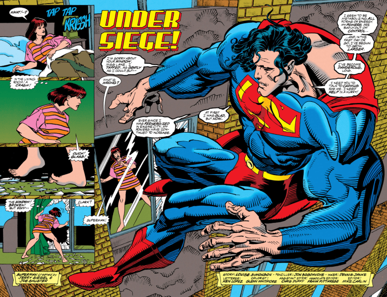 As you can see on the cover of Man Of Steel #33 by Louise Simonson and Jon Bogdanove, our hero is approaching Hulk proportions. In fact, he’s so big that when he tries flying by Lois’ apartment, he nearly brings the neighboring one down. Meanwhile, Lois and the rest of the world realize how Lex planned on destroying her after she submitted a story tying him to the missing Sasha Green. Instead, the headline claimed that Luthor’s mother was actually an alien. When I read that, I flipped out because it felt like a major oversight. These things have to go through editors. Well, we later learn that the copy editor approved the piece and then went missing, meaning Luthor’s not just using technology (he can get into any LexCorp computer) and good old fashioned bribery. He also gets her arrested for drunk driving, though I’m not sure which method he used for that. Meanwhile, Superman goes to Cadmus for help and Paul Westfield attempts to use the Parasite’s power-absorbing abilities, but that goes about as well as you’d think so they shoot him into space. Oh and this will play out big time soon, Lex makes a deal with Clawster of the Underworlds that will have ramifications for the entire city.